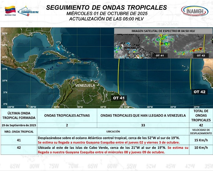 El Instituto Nacional de Meteorología e Hidrología (Inameh) prevé para este miércoles cielo parcialmente nublado, y algunas zonas con lluvias de intensidad variable en gran parte del país, ante la aproximación de las ondas tropicales Nro. 41 y Nro. 42 de la temporada.