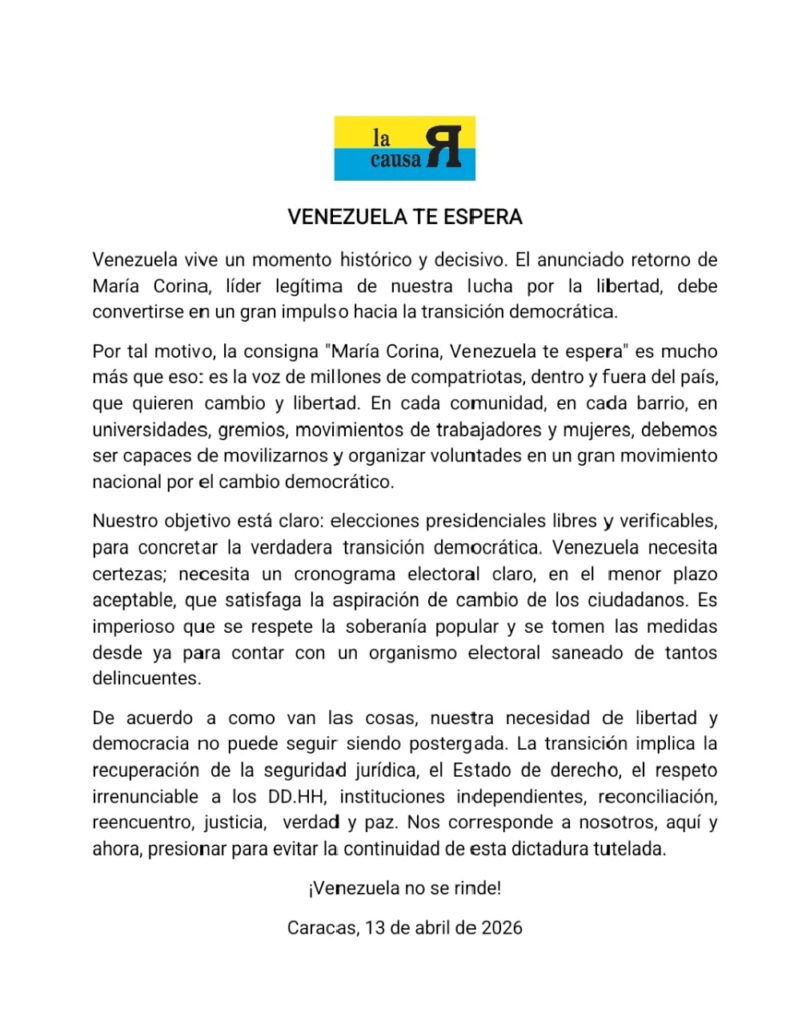 La Causa R advirtió que la necesidad de libertad y democracia «no puede seguir siendo postergada» y que la verdadera transición implica la recuperación de la seguridad jurídica, el Estado de derecho, el respeto a los derechos humanos, instituciones independientes, reconciliación, justicia, verdad y paz. «Nos corresponde a nosotros, aquí y ahora, presionar para evitar la continuidad de esta dictadura tutelada», concluye el comunicado, que cierra con un «¡Venezuela no se rinde!»