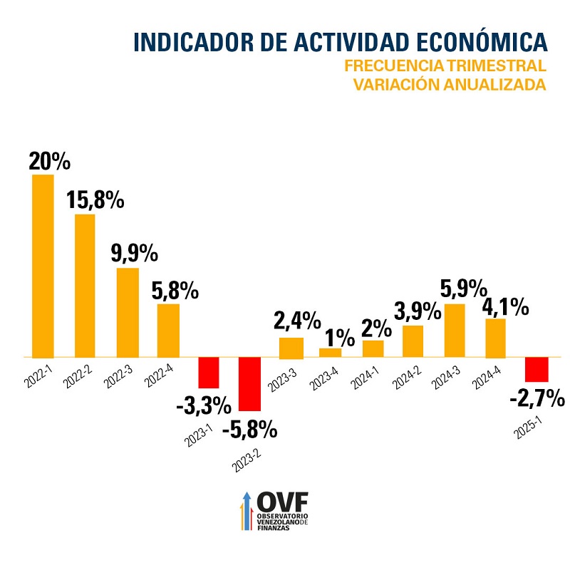 El más reciente reporte del Observatorio Venezolano de Finanzas (OVF), publicado este viernes 25 de abril, revela que la actividad económica de Venezuela registró una caída de 2,7% durante el primer trimestre de 2025, en comparación con el mismo período del año anterior.
