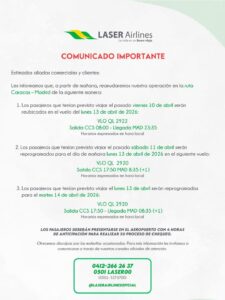 La aerolínea venezolana Laser Airlines anunció que retomará su operación en la conexión Caracas–Madrid a partir del lunes 13 de abril de 2026, luego de ajustes operativos que derivaron en cambios de itinerario y la reasignación de pasajeros afectados.