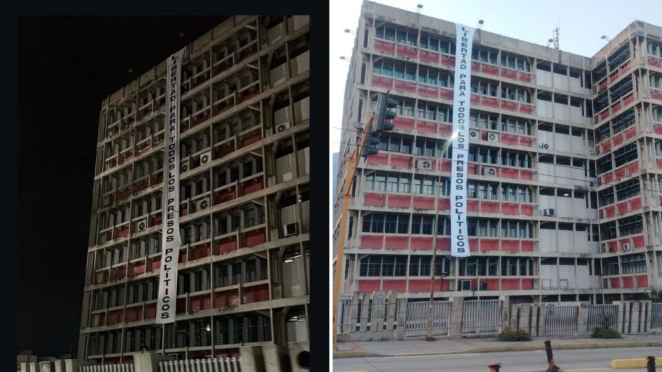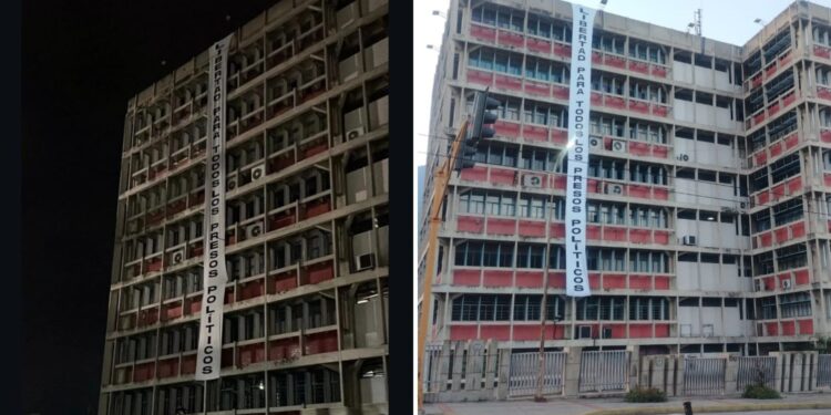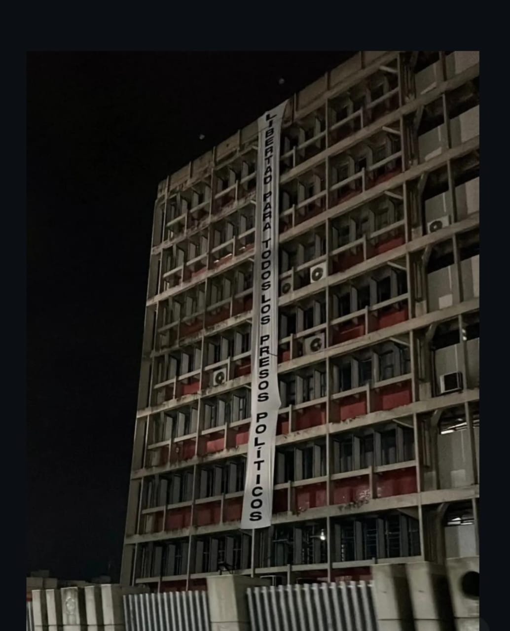 El mensaje, visible para toda la ciudad, reza «Libertad para todos los presos políticos».