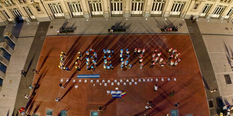 Decenas de venezolanos se reunieron este martes 3 de febrero en la Plaza Vaticano, junto al Teatro Colón de Buenos Aires, para exigir la liberación de todos los presos políticos que permanecen detenidos arbitrariamente en Venezuela. Con globos y luces formaron una gigantesca palabra «LIBERTAD», en una vigilia que coincidió con el primer mes de la captura y extracción de Nicolás Maduro.