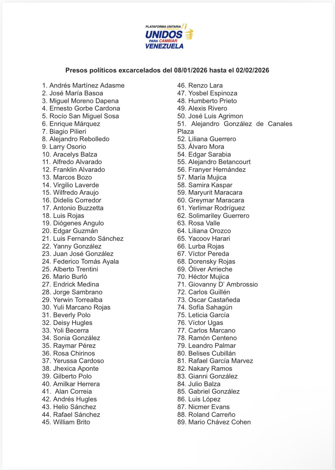 La Plataforma Unitaria Democrática publicó este lunes 2 de febrero la lista actualizada y confirmada de presos políticos excarcelados hasta las 12 del mediodía, que asciende a 349, una cifra muy distinta a los anunciados por la encargada del régimen chavista, Delcy Rodríguez, y a los 823 contabilizados por el ministro de Interior y Justicia, Diosdado Cabello.