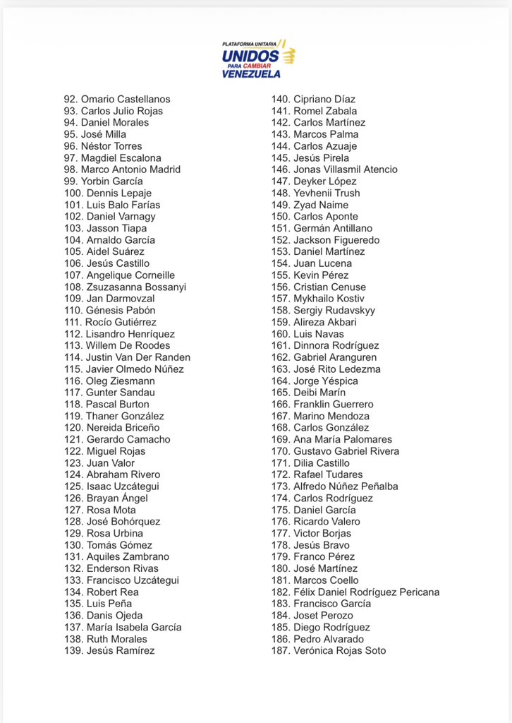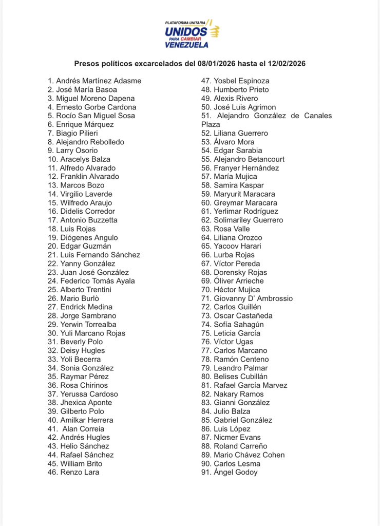 «Siendo las 9:30 p. m. del día de hoy, jueves 12 de febrero, esta es la cifra actualizada de liberaciones que hemos podido verificar desde nuestro último reporte. Condenamos que, en 4 días, solo se hayan sumado apenas 17 liberaciones, mientras los familiares de los presos políticos se mantienen en vigilia permanente a las puertas de los centros de reclusión. Para la libertad de todos los presos políticos solo se necesita voluntad politica», indicó el conglomerado de partidos políticos de la oposición en sus redes sociales.