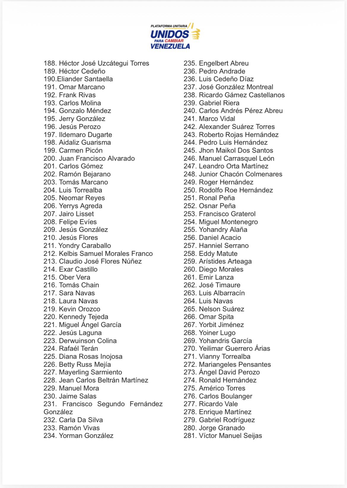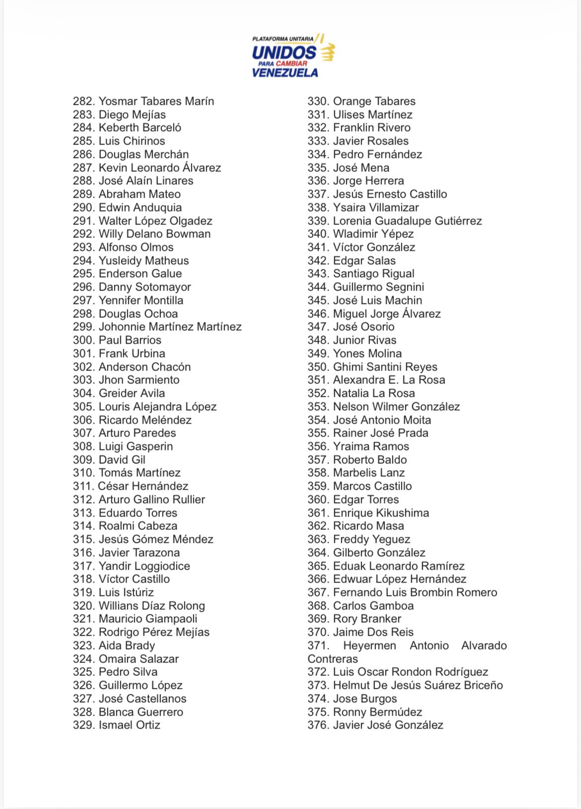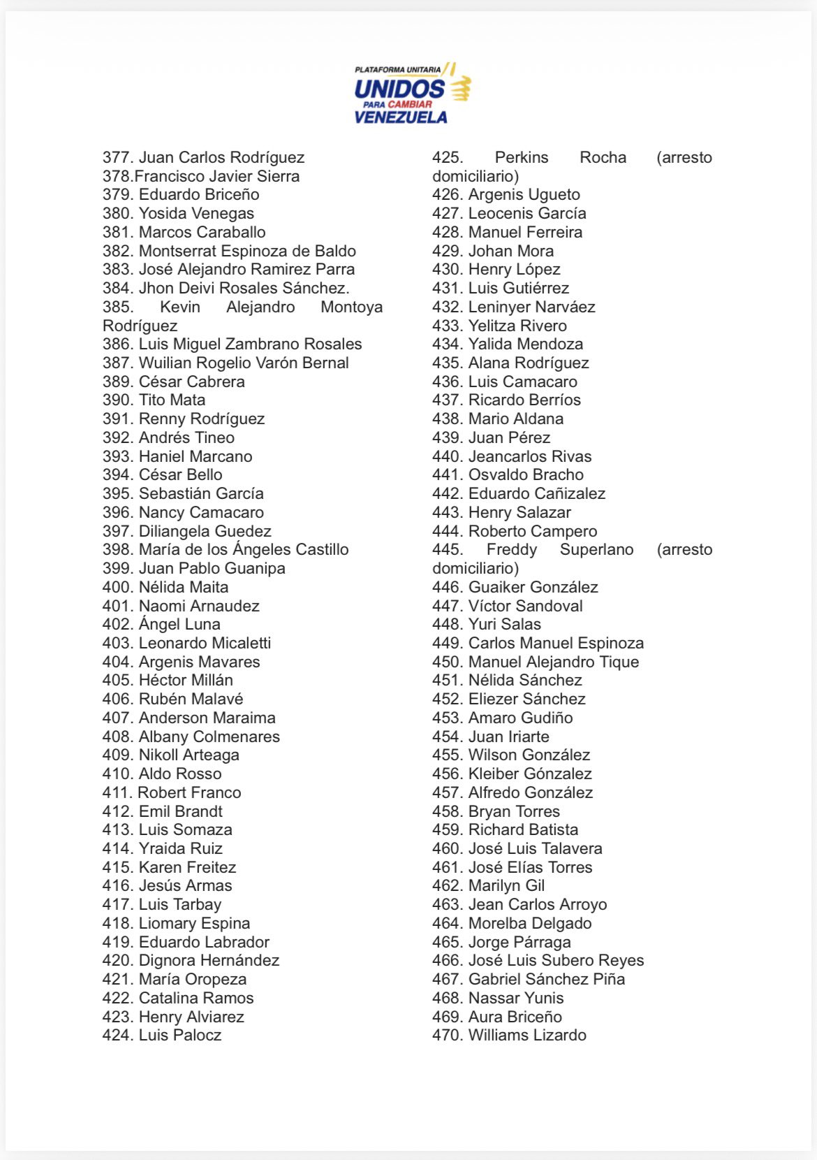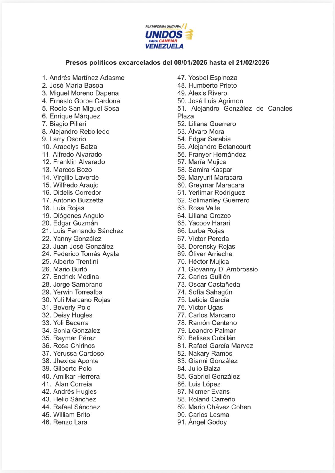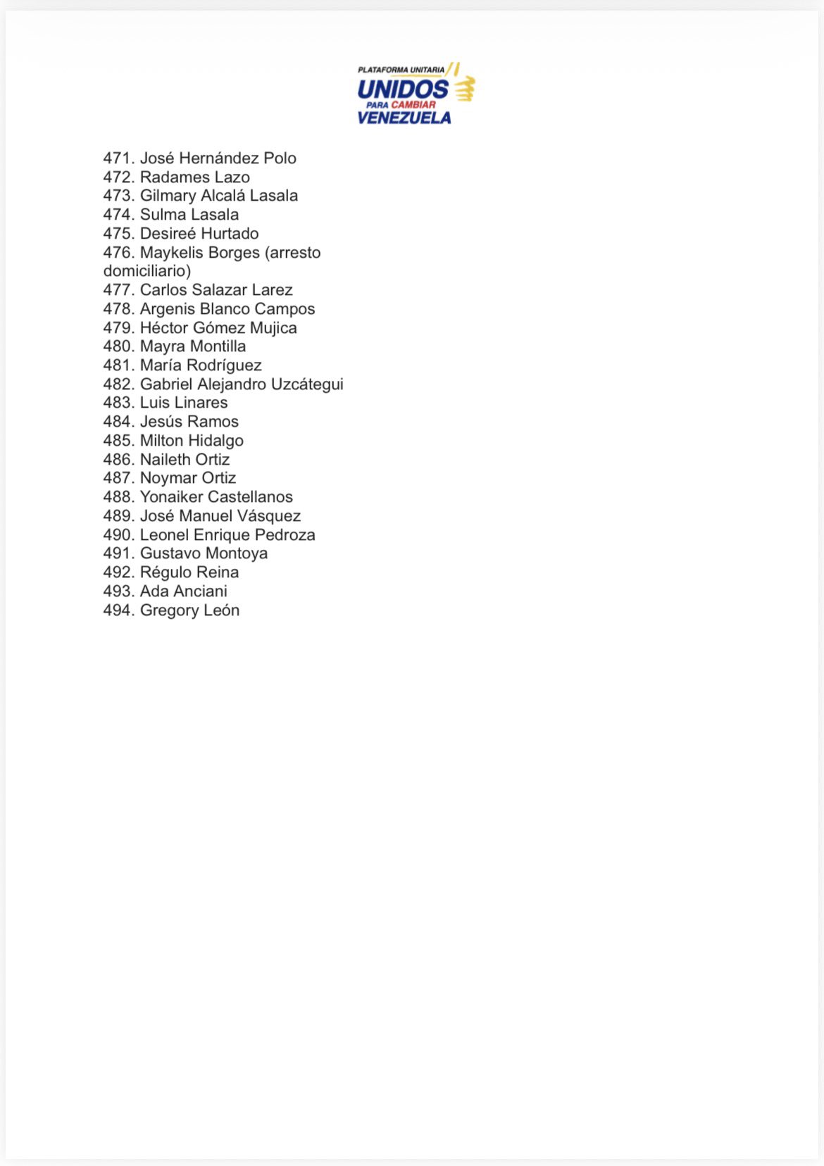 La Plataforma Unitaria Democrática (PUD) publicó el sábado un listado actualizado con la cifra de 494 presos políticos excarcelados confirmados entre el 8 de enero y el 21 de febrero a las 10 de la noche.
