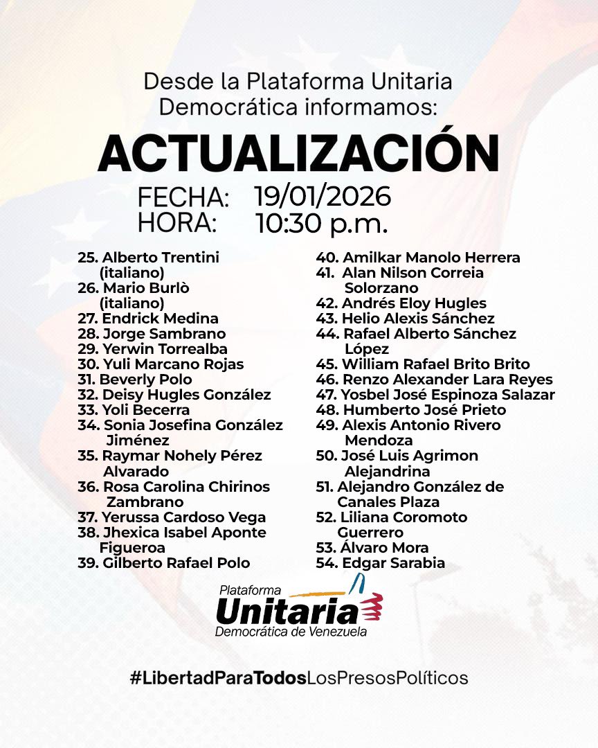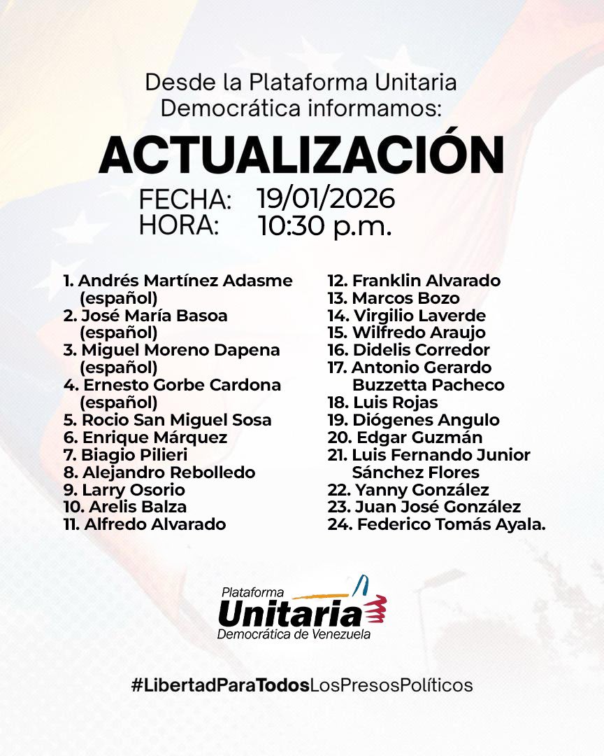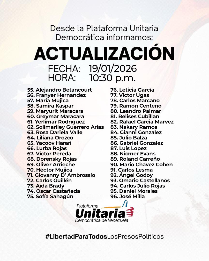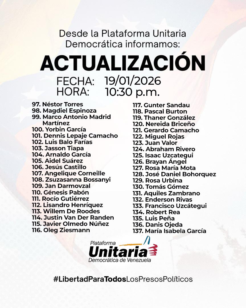 La Plataforma Unitaria Democrática publicó este domingo 18 de enero una lista actualizada y confirmada de presos políticos excarcelados, que ascienden a 163, una cifra muy distinta a los 406 afirmados por la encargada del régimen chavista, Delcy Rodríguez.
