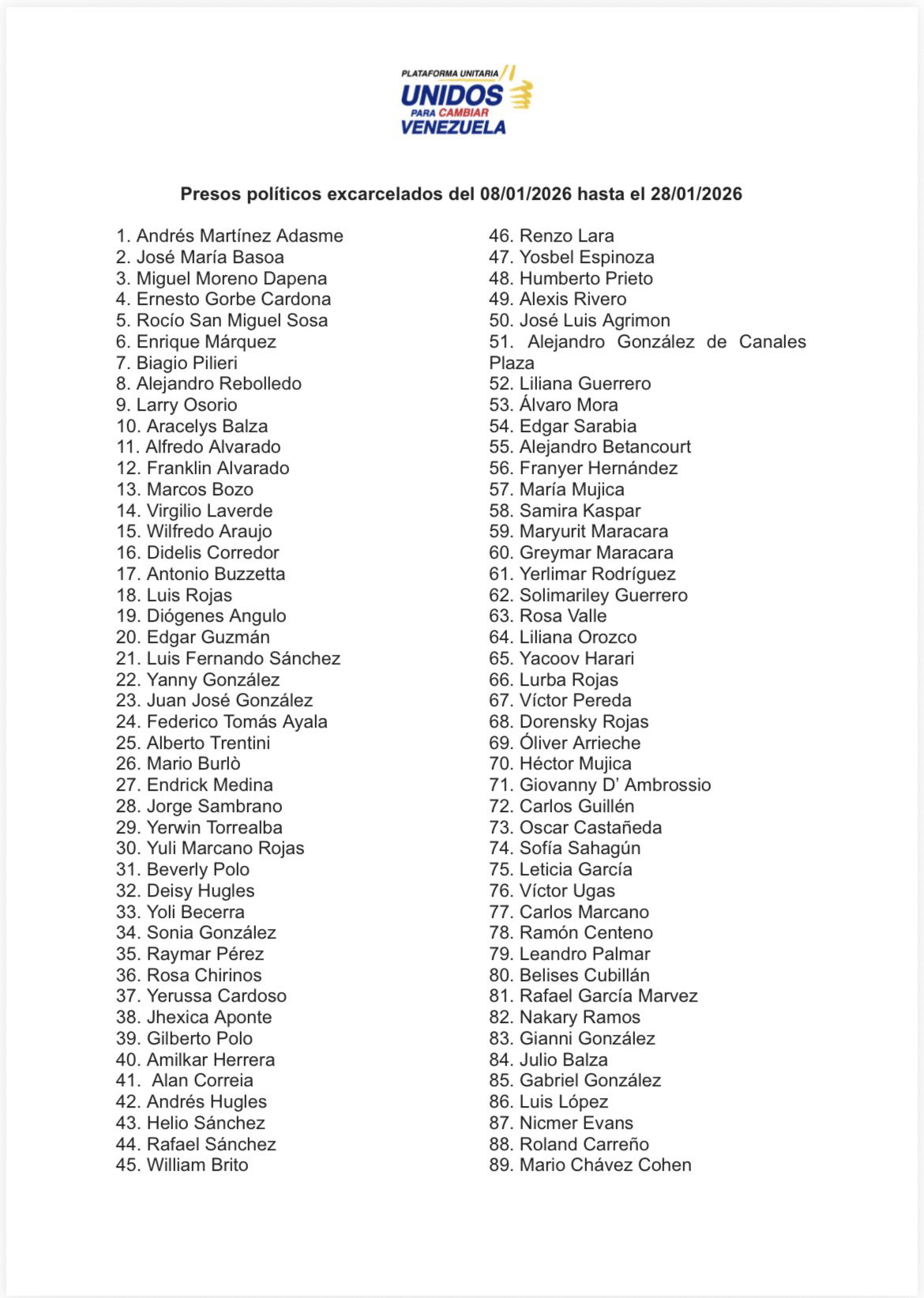 La Plataforma Unitaria Democrática publicó este domingo 18 de enero una lista actualizada y confirmada de presos políticos excarcelados, que ascienden a 289, una cifra muy distinta a los anunciados por la encargada del régimen chavista, Delcy Rodríguez, y el ministro de Interior y Justicia, Diosdado Cabello.