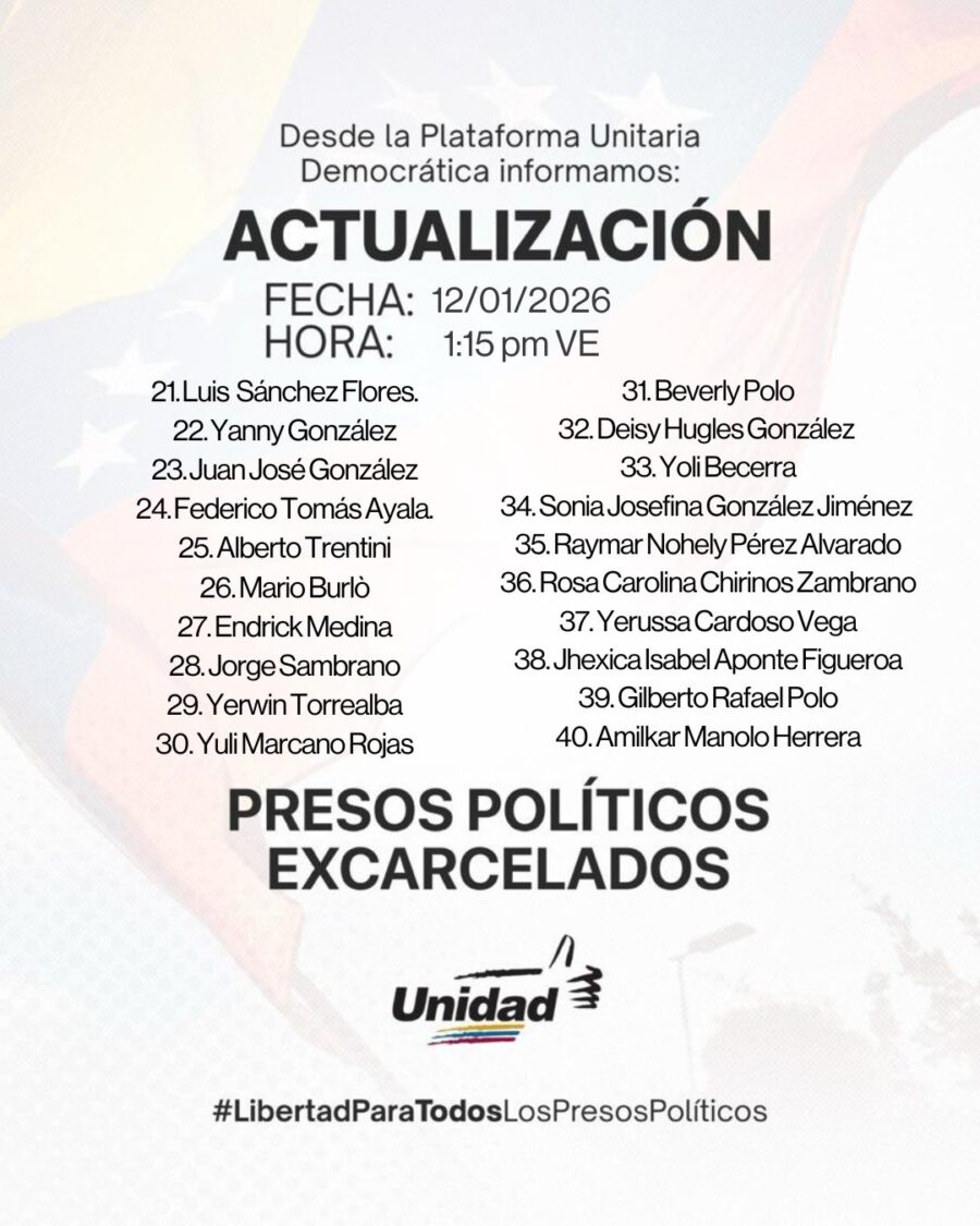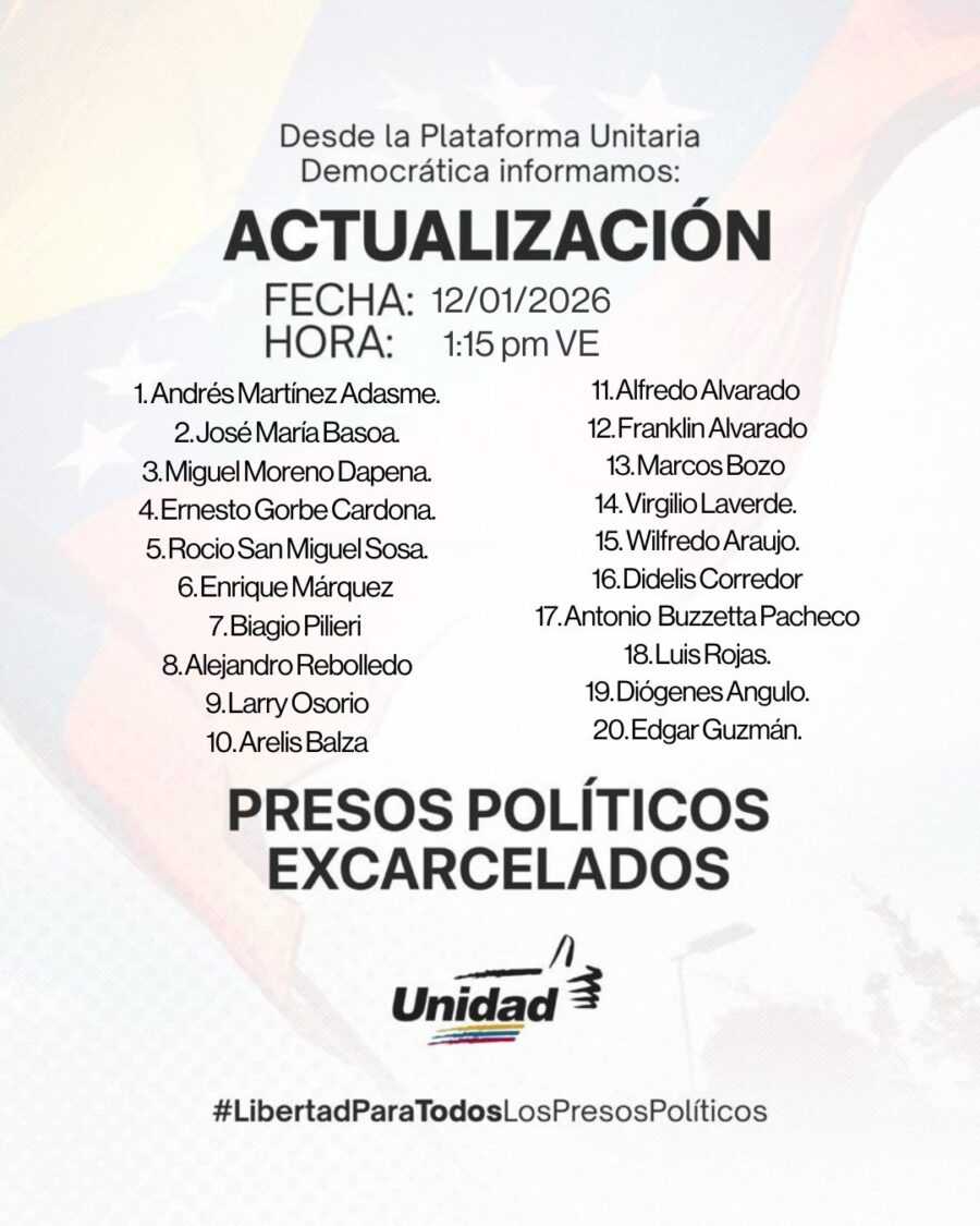 La Plataforma Unitaria Democrática publicó en sus redes sociales un listado con los nombres de los 56 excarcelados confirmados entre el 8 y el 12 de enero a la 1:15 de la tarde.