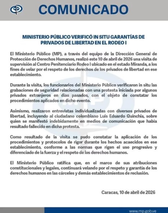 El Ministerio Público a la orden del régimen chavista afirmó este viernes que verificó el cumplimiento de «procedimientos y protocolos de rigor» en la cárcel El Rodeo I, en el estado Miranda, donde esta semana los familiares de presos políticos denunciaron represión tras una protesta de los detenidos.