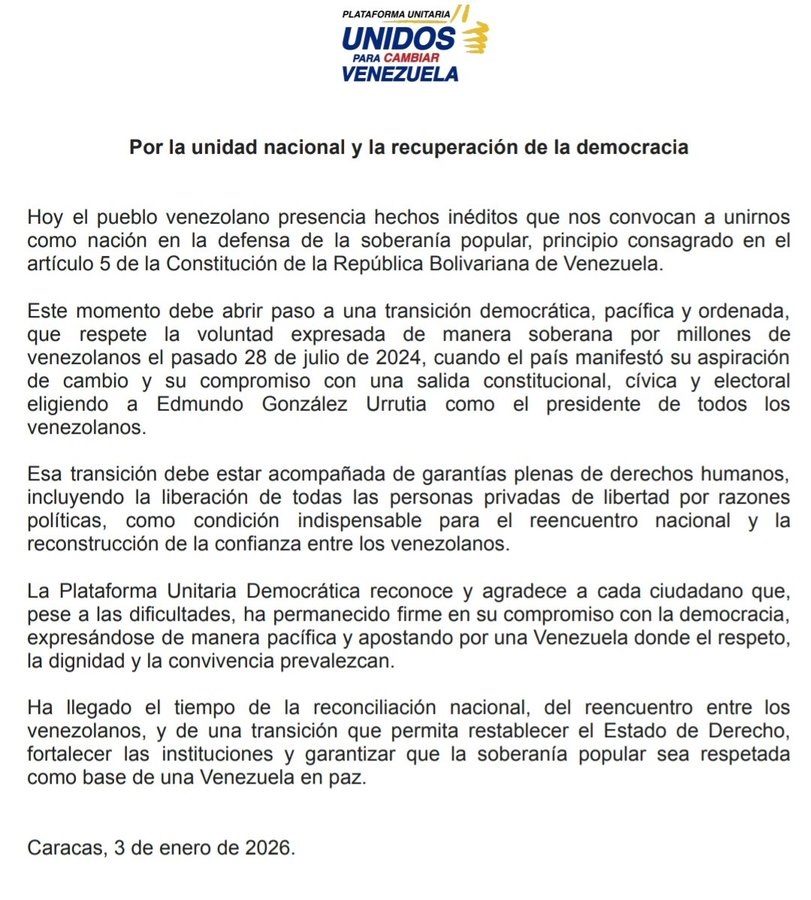 La Plataforma Unitaria Democrática (PUD) emitió un comunicado este sábado 3 de enero tras la extracción de Nicolás Maduro y Cilia Flores por el gobierno del presidente de Estados Unidos, Donald Trump, así como el ataque a varios objetivos en Caracas y otros estados venezolanos.