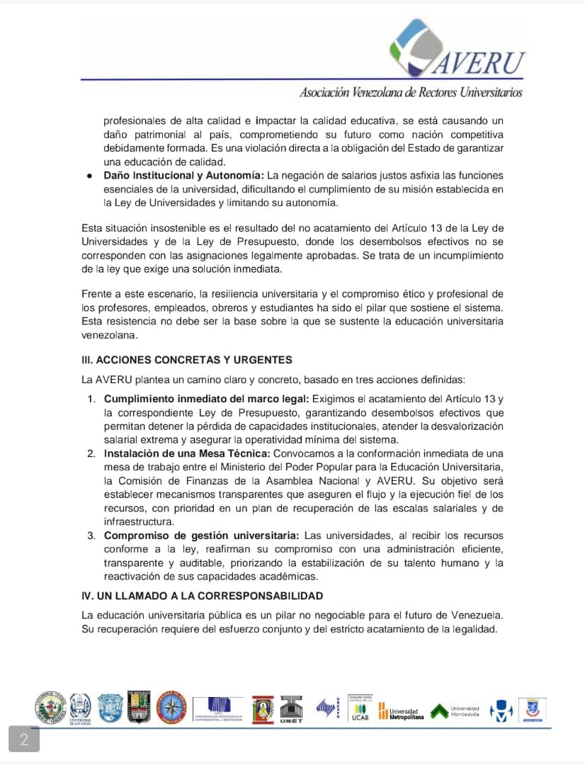 En un comunicado publicado por la Federación de Asociaciones de Profesores Universitarios de Venezuela (FAPUV) en redes sociales, los rectores señalaron que los salarios actuales del personal académico, administrativo y obrero impiden cubrir necesidades básicas, lo que afecta la continuidad de la actividad universitaria y compromete la calidad de la educación superior.