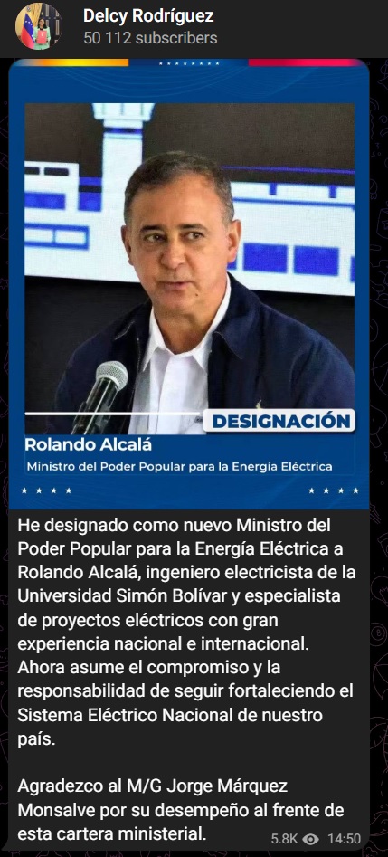 La encargada del régimen chavista, Delcy Rodríguez anunció este miércoles la designación de Rolando Alcalá como nuevo ministro para la Energía Eléctrica, en medio de una crisis prolongada del sistema eléctrico nacional que sigue afectando a millones de venezolanos.