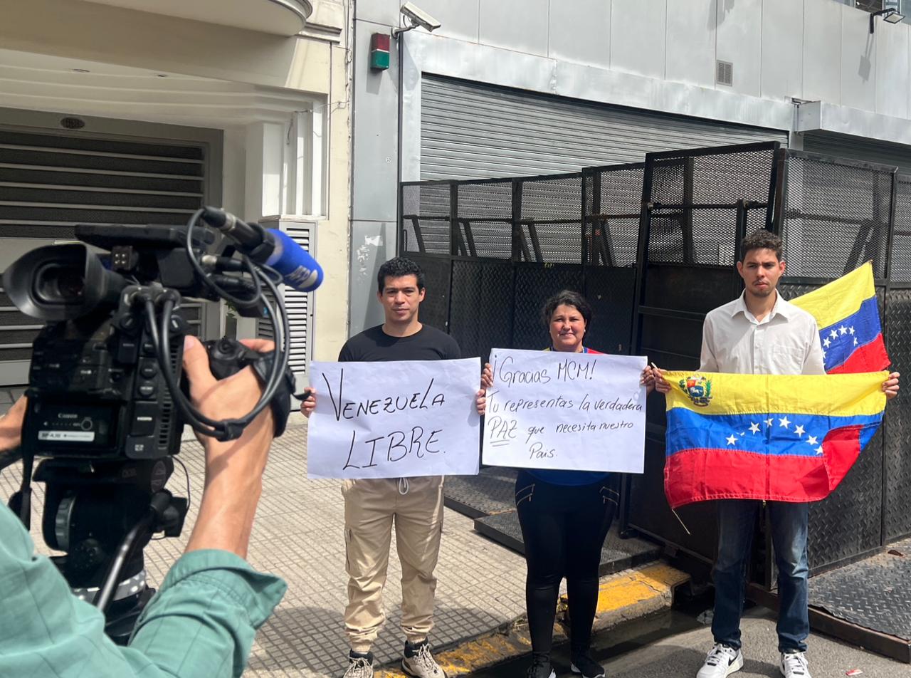 Un grupo de venezolanos se concentró este viernes frente a la Embajada de Venezuela en Argentina —cerrada desde agosto de 2024— para celebrar el Premio Nobel de la Paz otorgado a la líder opositora María Corina Machado.
